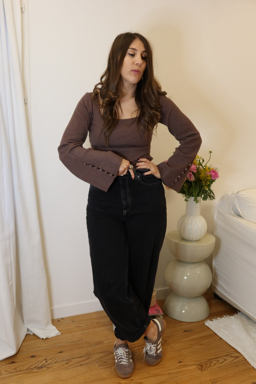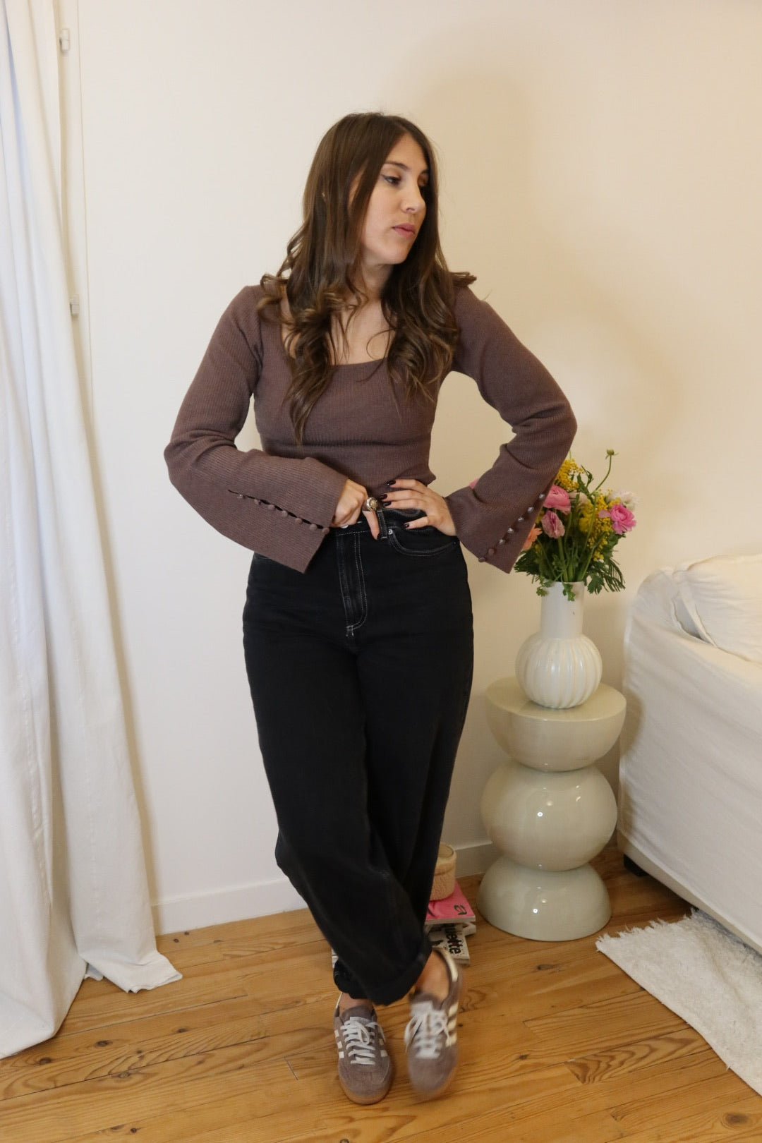manches évasées avec boutons décoratifs sur le bas des manches